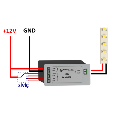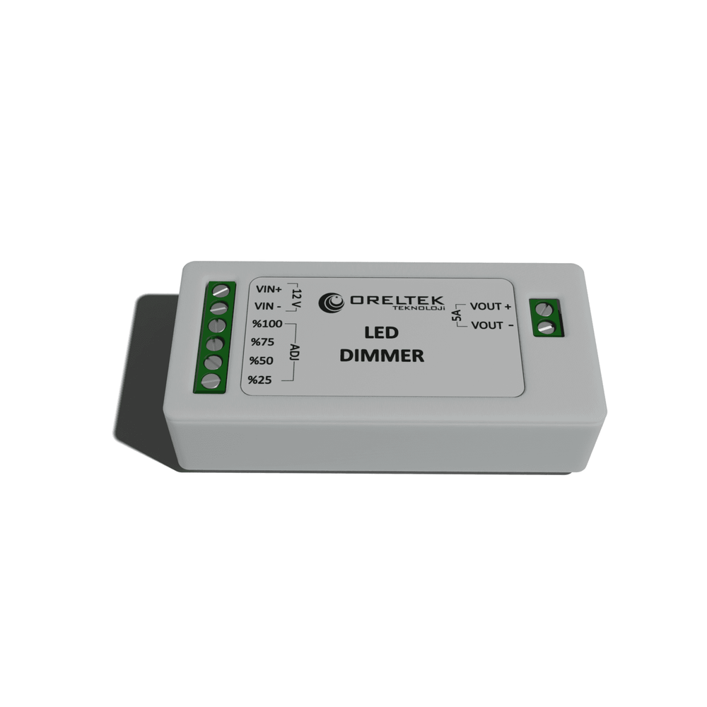 ORELTEK Kademeli LED Dimmer Modülü, 12V LED aydınlatmaların parlaklık seviyesini %25 – %50 – %75 – %100 kademelerinde ayarlayabilmenizi sağlayan bir kontrol modülüdür.